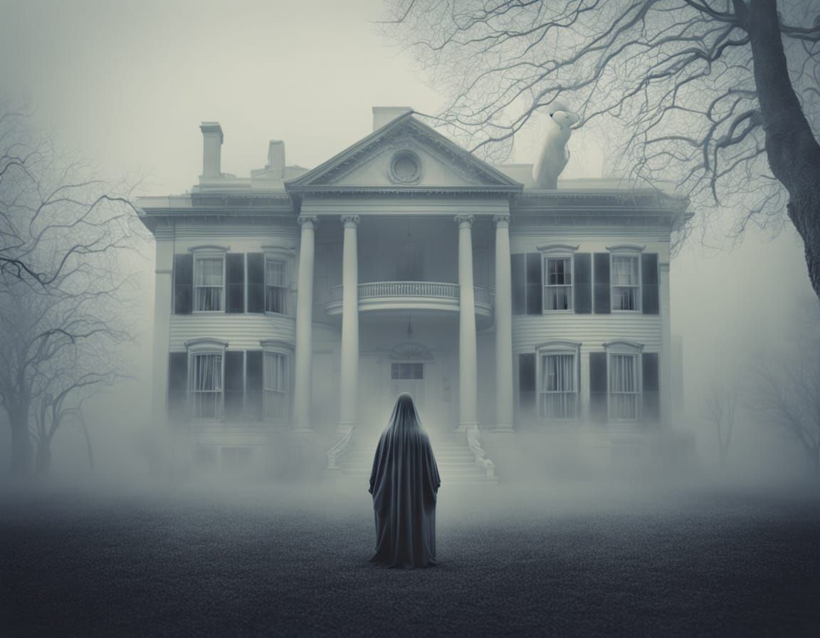 This cinematic image captures a spectral figure in front of a white house, enveloped by dense fog. Shot with film grain and dramatic lighting, it evokes a haunting atmosphere.