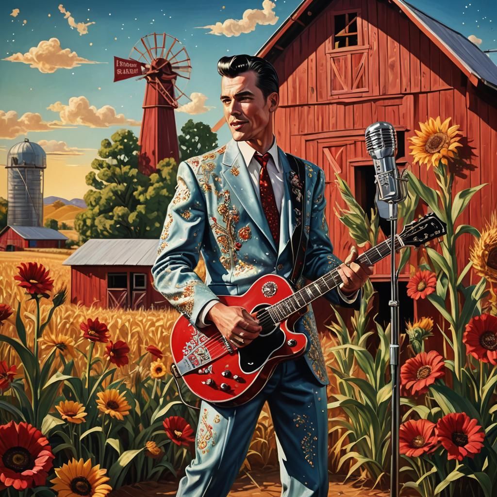 A vibrant digital painting of a 1950s country singer performing on stage. The image captures the energy of rockabilly with dynamic lighting, vivid details, and a high-contrast color palette.
