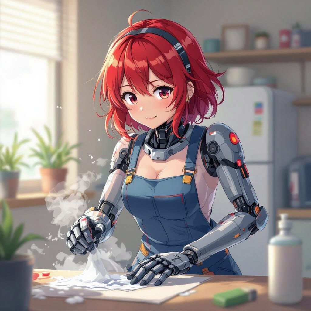 This image shows a young woman with red, short hair rapidly dusting a room. Created in a flat manga style with deep colors and cinematic lighting.