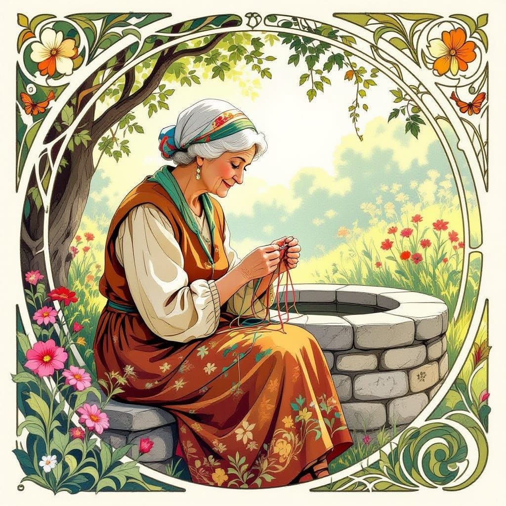 This image is an Art Nouveau illustration featuring a kind grandmother knitting by an old well. It showcases flowing lines, organic shapes, and floral motifs with dappled sunlight and an ethereal glow.
