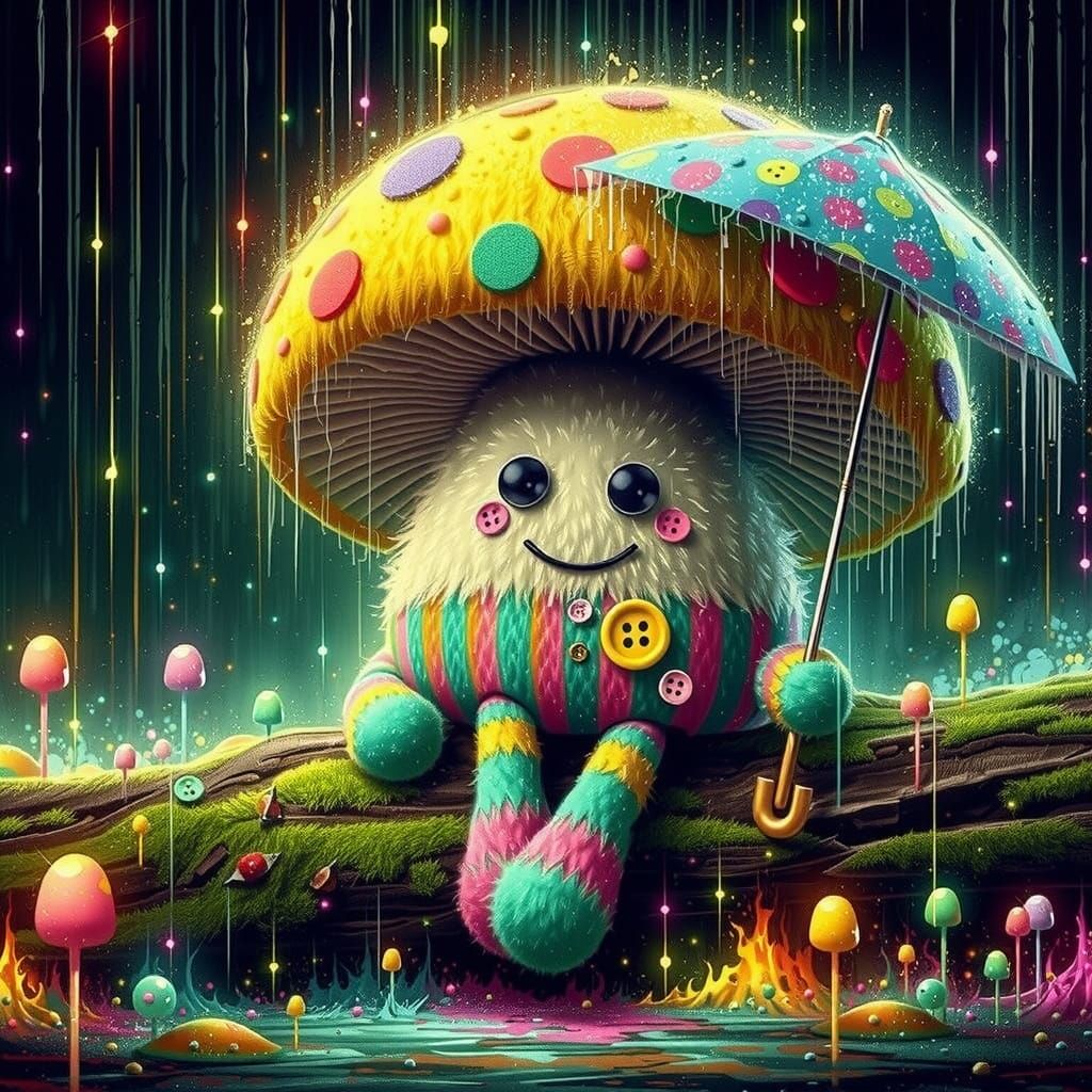 A whimsical digital art mushroom spirit with a striped shirt and button eyes smiles cheerfully, leaning on a log with a polka-dot umbrella. Features candy-inspired, pastel neon colors and dynamic brushstrokes.