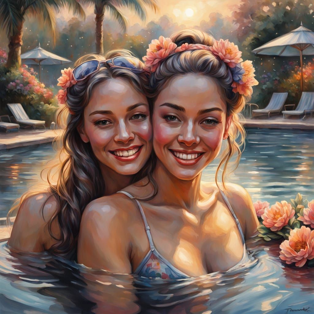 A hyperdetailed charcoal drawing shows a beautiful woman with a bright smile sitting by a pool. This portrait shot, rendered in an ethereal fantasy style, features a soft, misty atmosphere.