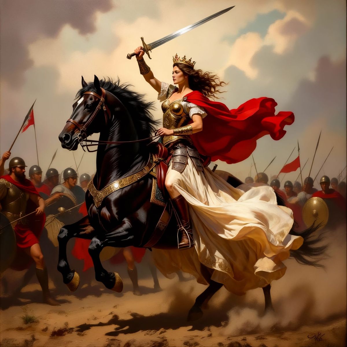 This image depicts a fearless warrior Queen on a black steed, sword raised, leading her troops into battle. Rendered in an antique oil painting style.