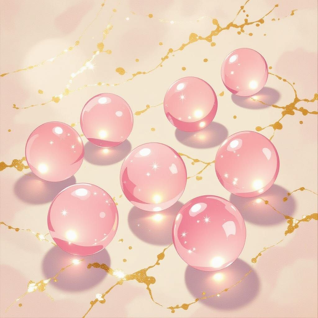 This image features glowing pink marbles on a textured, pastel background with gold dust, in a charming illustration style inspired by classic children's books.