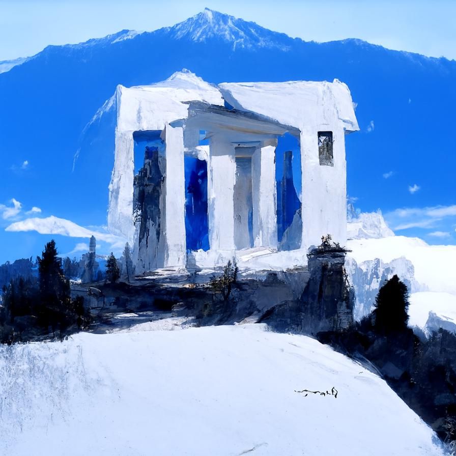 A picturesque Greek temple stands against a mountainous backdrop. The color palette is dominated by white and blue tones, creating a serene yet slightly ominous atmosphere.