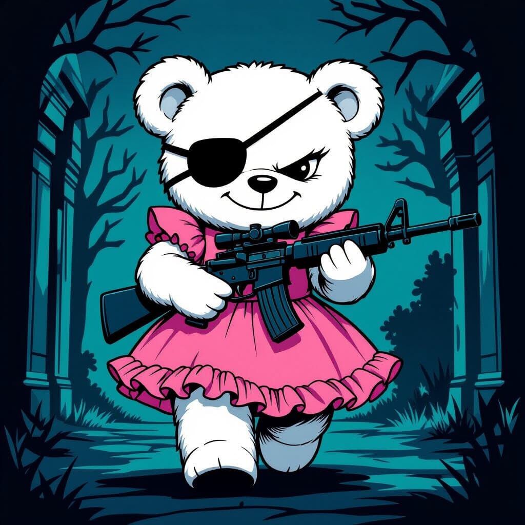This image shows a menacing white teddy bear in a pink dress and eyepatch, holding a rifle in an eerie estate. The artwork features a vibrant, high-contrast cartoon style with bold lines, inspired by classic animated series.