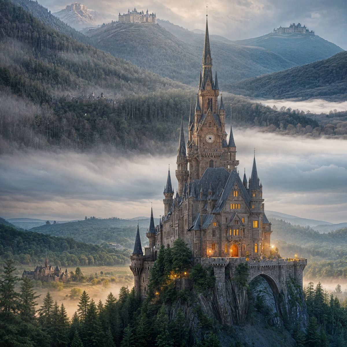 This image shows a maximalist digital matte painting of an ethereal fantasy landscape shrouded in mist. The image is intricately detailed with dramatic atmosphere, reminiscent of luminist paintings.