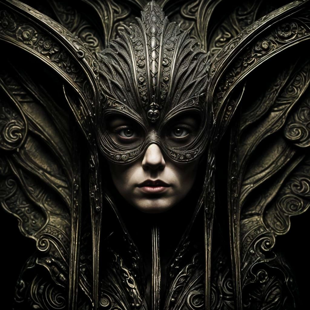 This image is a close-up portrait of a mysterious figure, reminiscent of the Pied Piper, set against a vibrant art nouveau background. The image blends the dark, psychedelic elements of HR Giger's style with the ethereal quality of stained glass vitrail.