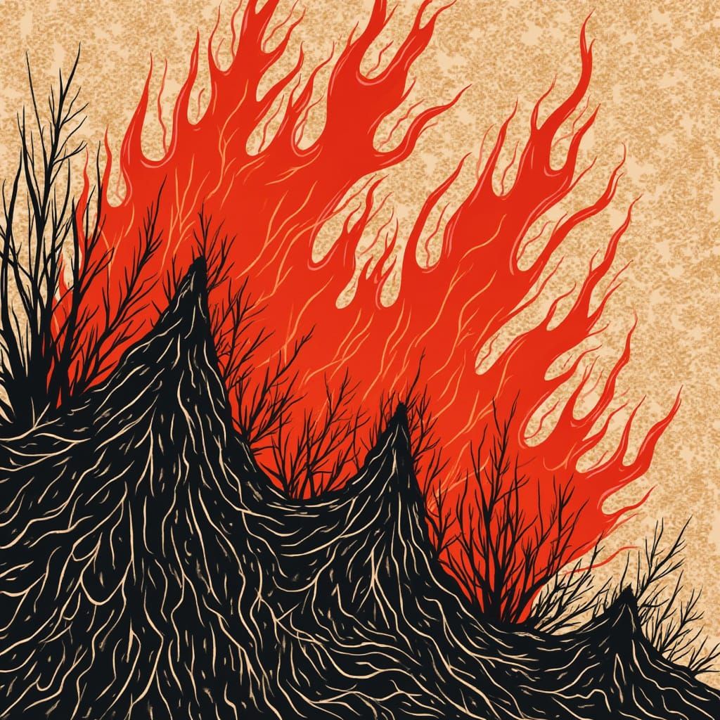 A striking sumi-e art piece featuring a Japanese hemp pattern background with bold, red flames and strong ink lines, evoking a sense of sacred energy and minimal detail in a stylized Japanese design with bold contrast