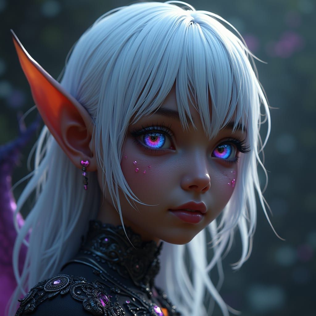 This image shows a dark elf with heterochromatic eyes in a high contrast fantasy setting. Digital painting techniques, dynamic lighting, hyperdetailed textures and ornate lines create a captivating portrait.