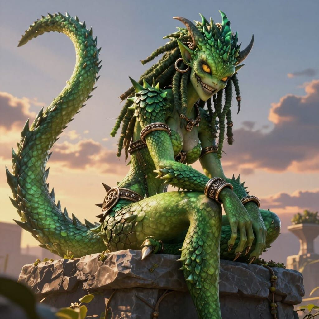 This hyperdetailed image features a terrifying monster girl with green, spiky scales, a long tail, dreadlocks, and metal hoop bracelets. Dramatic lighting enhances the opulent, intricate textures of this atmospheric scene.