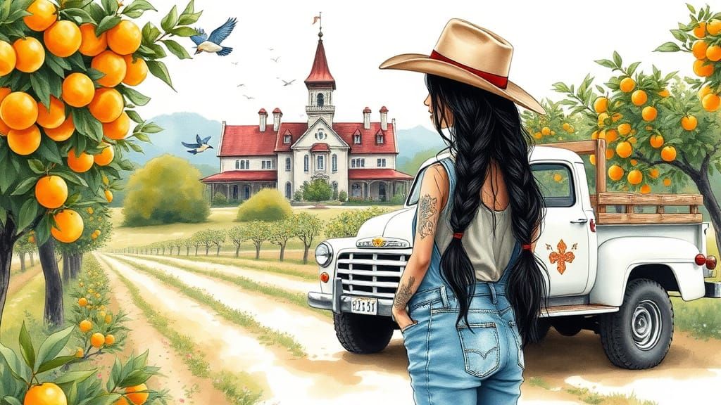 This image shows a woman in a serene summer setting, surrounded by a charming chateau, a vintage truck, and lush orange orchard, with a white lion by her side, captured in a delicate Sumi-E style painting.