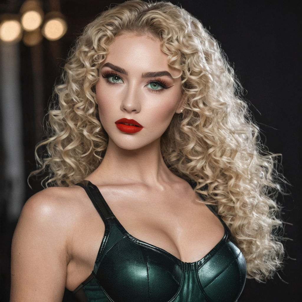 This hyperrealistic digital art depicts a striking woman with blonde curly hair and green eyes, wearing a leather skirt and mesh sports bra. Cinematic lighting enhances her dynamic pose.