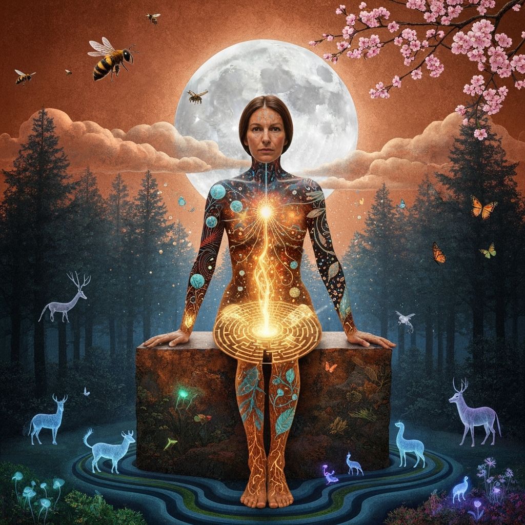 This image shows a 1970s female sculptor within her large abstract artwork. Rendered in a surreal bio-art collage style with mystical and botanical elements, it symbolizes transformation and self-discovery.