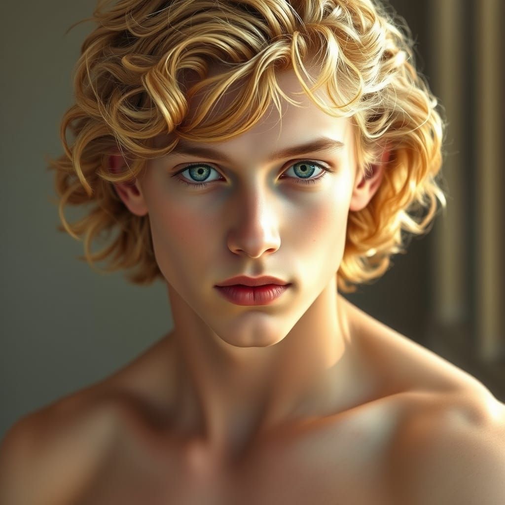 A captivating, dreamlike portrait of a young man exuding a radiant, god-like aura, reminiscent of Greek mythology, set against a warm, golden color palette with subtle, sunlit textures.