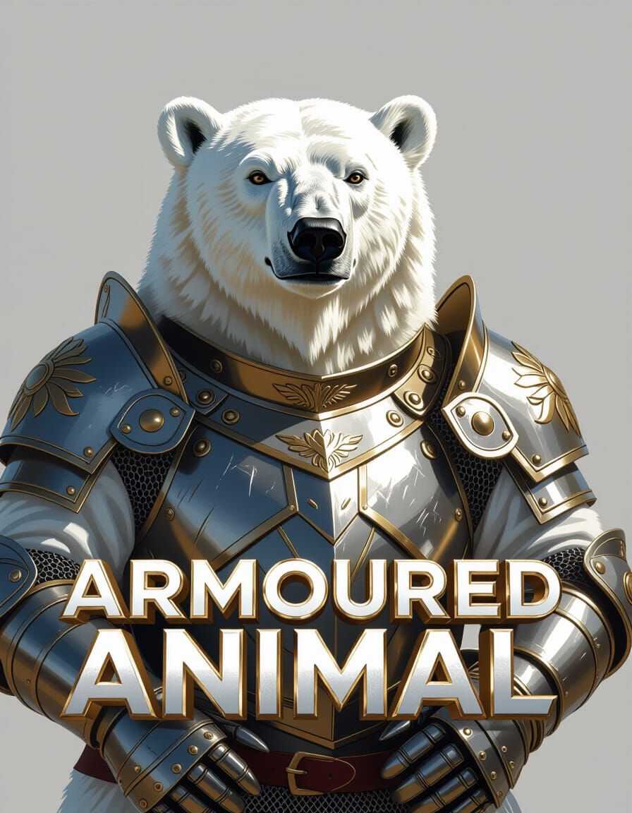 A striking picture of a polar bear in silver and gold plated armor. The artwork features a 3D text render and blends digital painting with photorealistic rendering.