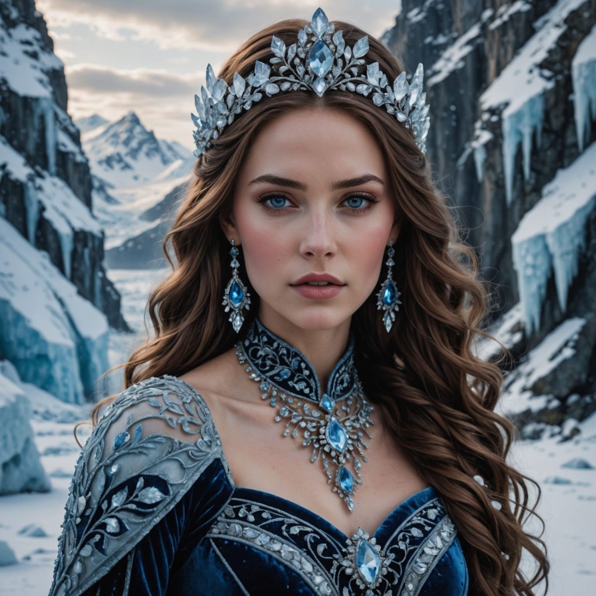 This hyperrealistic image features a beautiful ice queen in an intricate blue velvet dress and detailed jewelry, set against a snowy polar environment. Masterpiece quality with extreme detail.