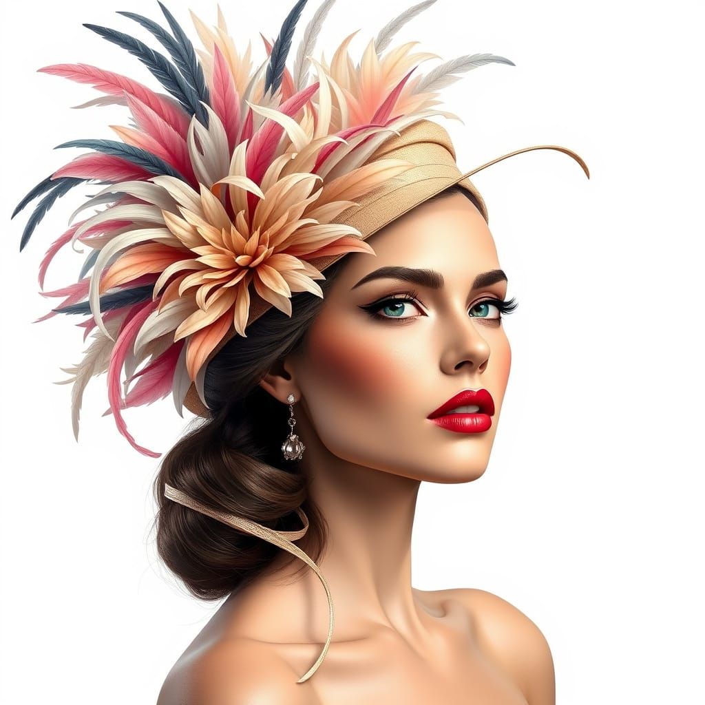 A beautiful woman wearing an elegant hat with feathers, in the style of Ashley Wood and Raymond Swanland, digital art painting, pastel colors, white background, detailed , portrait of the subject, fine brush strokes.