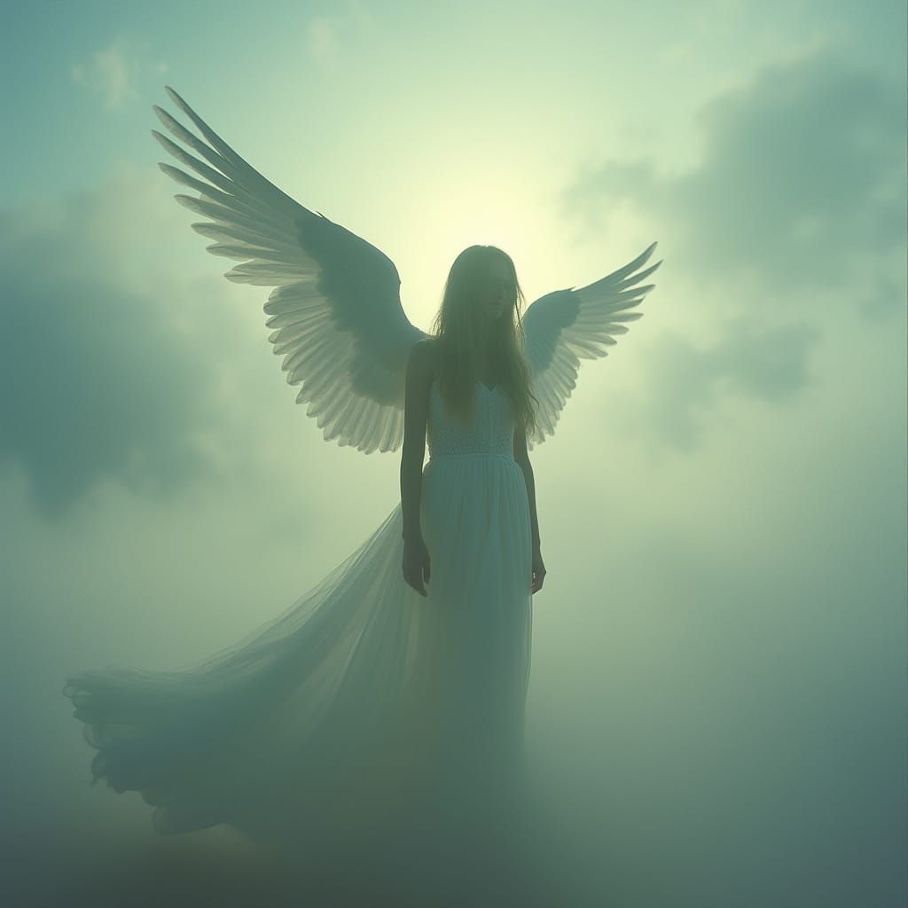 A captivating image of an ethereal angel girl in a white gown, posed among misty clouds. The cinematic composition features dramatic lighting and film grain, reminiscent of classic cinematography.