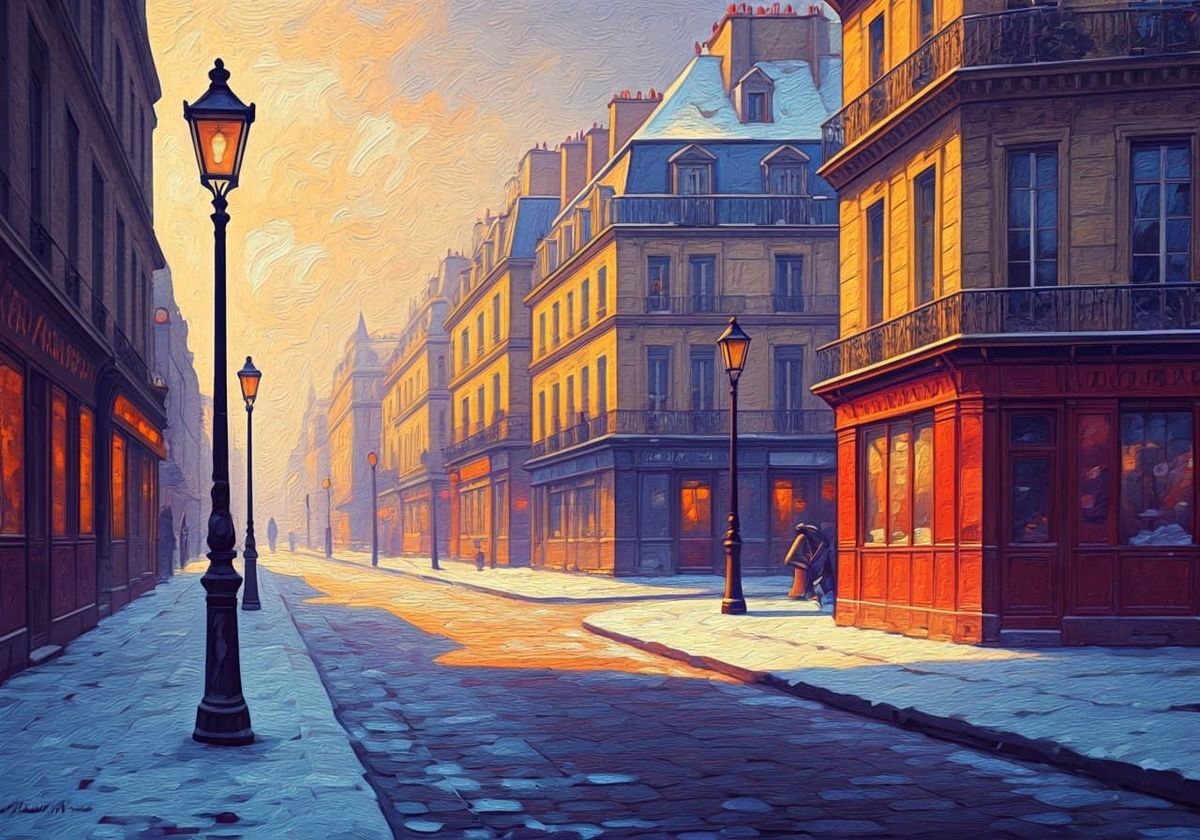A winter scene of a Paris street, captured in a colorful Impressionist style, with purple and orange tones evoking a sense of warmth and beauty