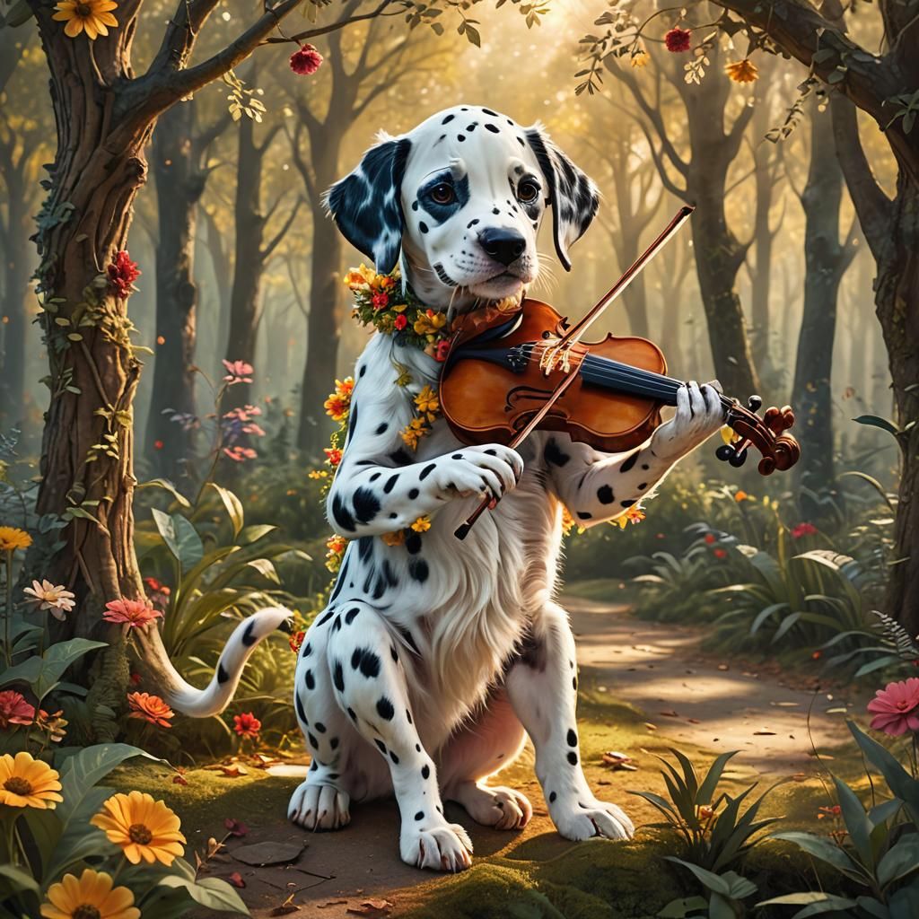 This image shows a dalmatian puppy playing the violin in a magical forest. The matte painting features warm colors, intricate details, and vibrant hues, with bokeh enhancing the puppy's black spots.