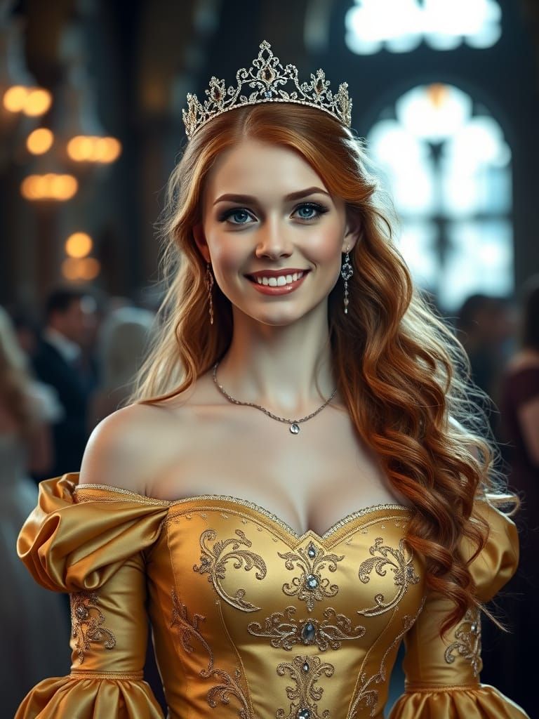 A stunning image of a medieval princess in a beautiful Belle-inspired ball gown, surrounded by opulence and grandeur at a castle ball, captured with professional photography and bokeh lighting effects.