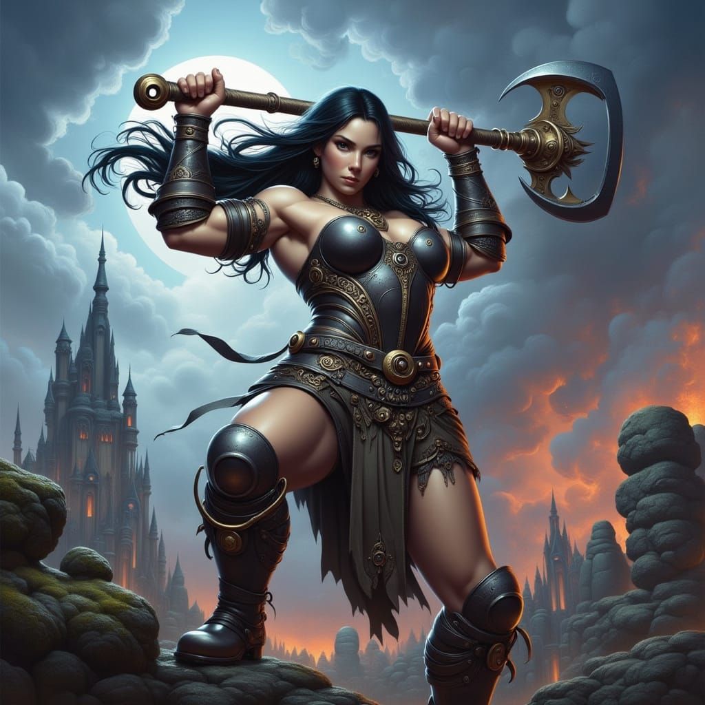 A powerful female elf in detailed leather armor stands on ancient ruins, wielding a large axe. Digital art features dramatic lighting and high contrast, inspired by classic fantasy illustration.