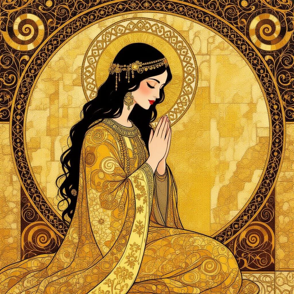 A digital painting of a woman in prayer, wearing a golden robe with geometric patterns. The artwork evokes the golden period of art nouveau with symbolic ornamentation and elegant lines.
