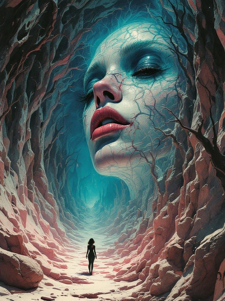 This image shows a classic pinup woman emerging from a dark, surreal landscape with eerie, microscopic details and a glossy finish, blending decay and candy-colored perfection.