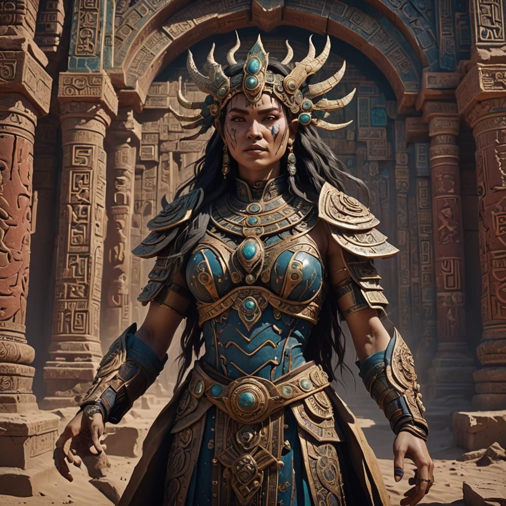 This image shows a malicious female deity within a pagan temple, set against the stark backdrop of the Gobi desert. The artwork features deep colors and intricate details, in a fantasy concept art style.