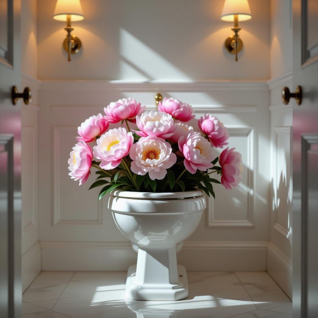 A surreal image of peony bushes growing from a toilet in a bright bathroom. The cinematic lighting and film grain give the image a dramatic, film-like quality.