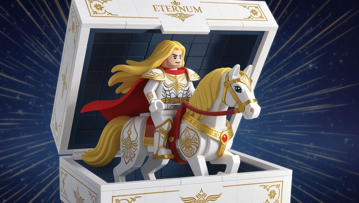 A heroic fantasy image of a majestic god character in golden armor, riding a horse surrounded by light, set amidst a detailed Lego-style toy box with elegant packaging and miniature brick details.