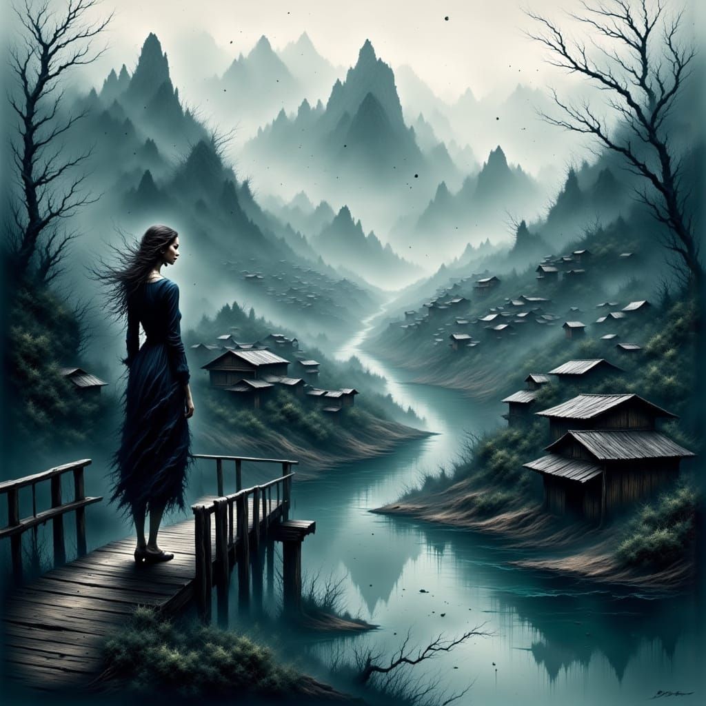 This image captures a poignant moment of a woman standing on a bridge, gazing at a serene Guizhou water village, evoking a sense of wistfulness and connection to nature.