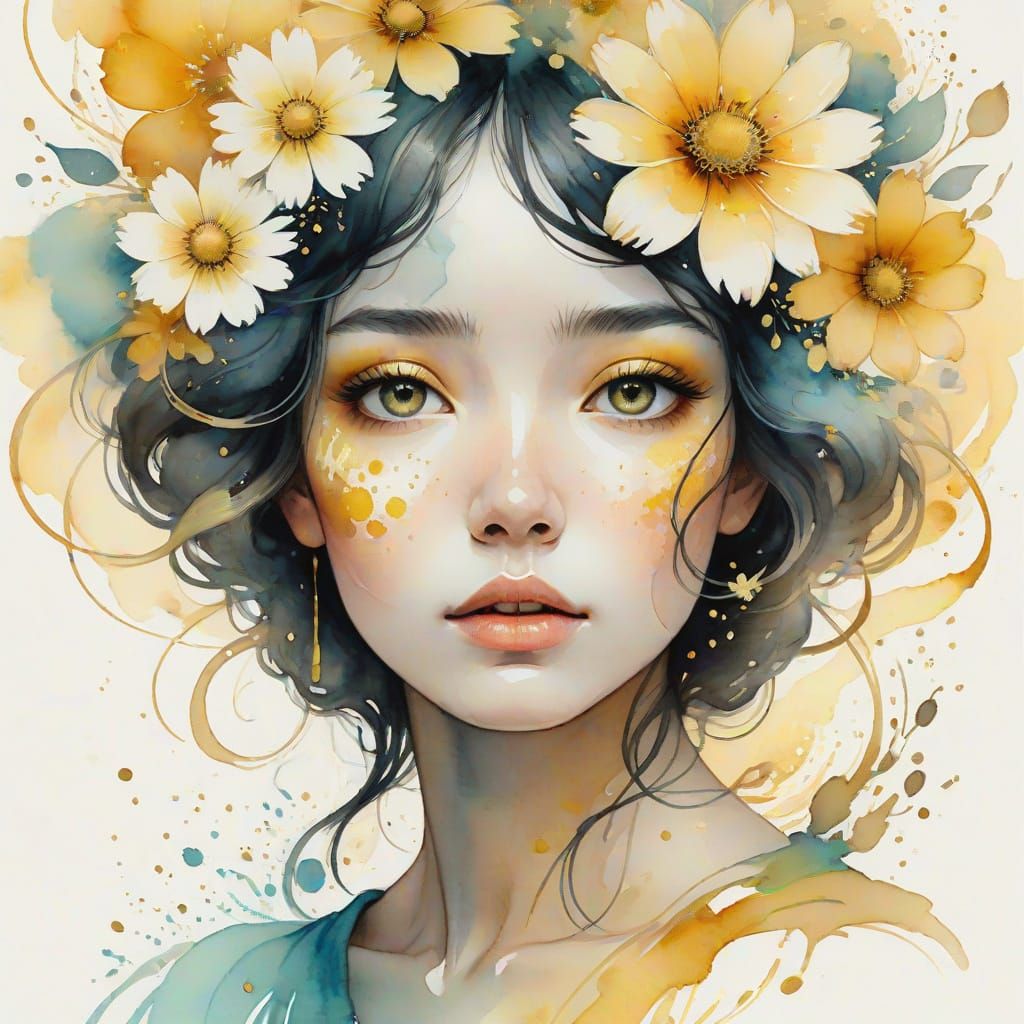 This image showcases a dreamy, ethereal flower illustration with a woman's face at its center, surrounded by soft, delicate petals and intricate patterns, created with colored ink and watercolor techniques, featuring light pastel yellow and gold hues and delicate brushstrokes.