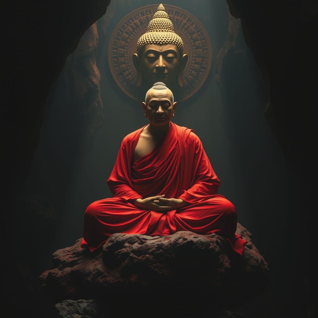 A striking picture of a monk in red robes meditating in a dark, damp cave. The background features a Buddha face with gothic and futuristic elements in a Beksiński-inspired style.