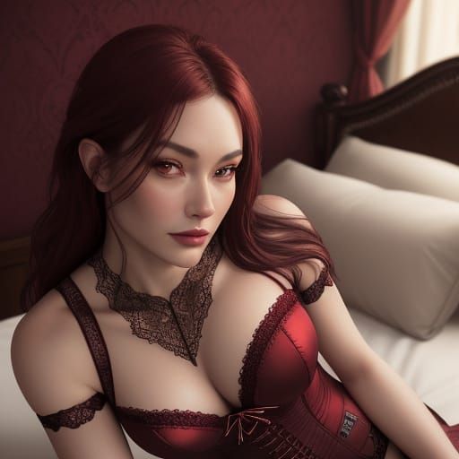 This hyper-realistic image features a woman in a detailed burgundy lace corset and stockings, posing seductively. The art style emphasizes photorealism with intricate detail and a deep burgundy and gold color palette.