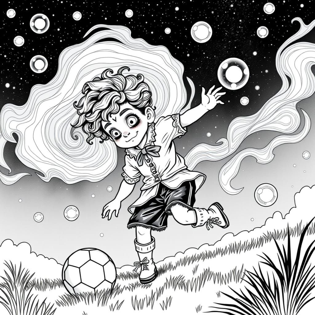 A whimsical black and white line drawing of a 7-year-old harlequin child playing soccer at night, surrounded by a surreal sky with stars, bubbles, and aurora-like swirls.