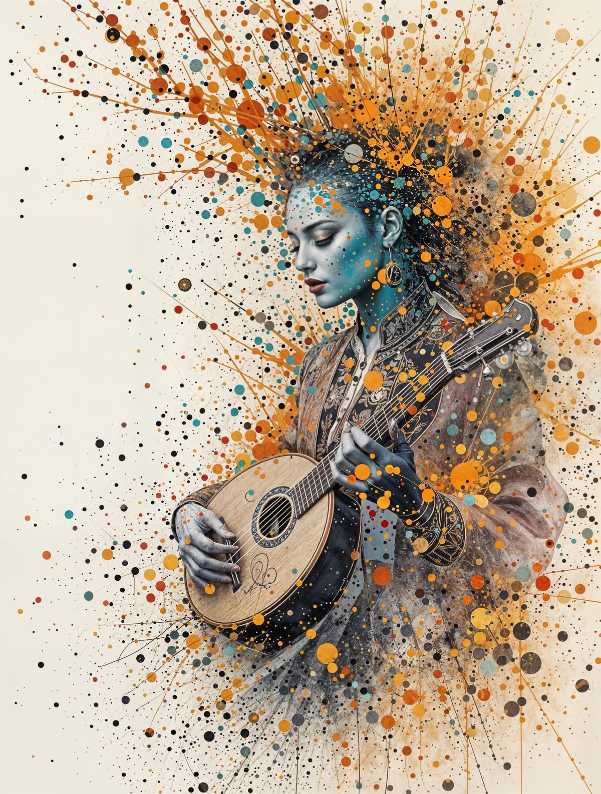 This vibrant image depicts a gender-fluid oud player disintegrating into a swirling mix of ink splashes and calligraphic strokes, blending controlled chaos with ethereal beauty in a celebration of music and art.
