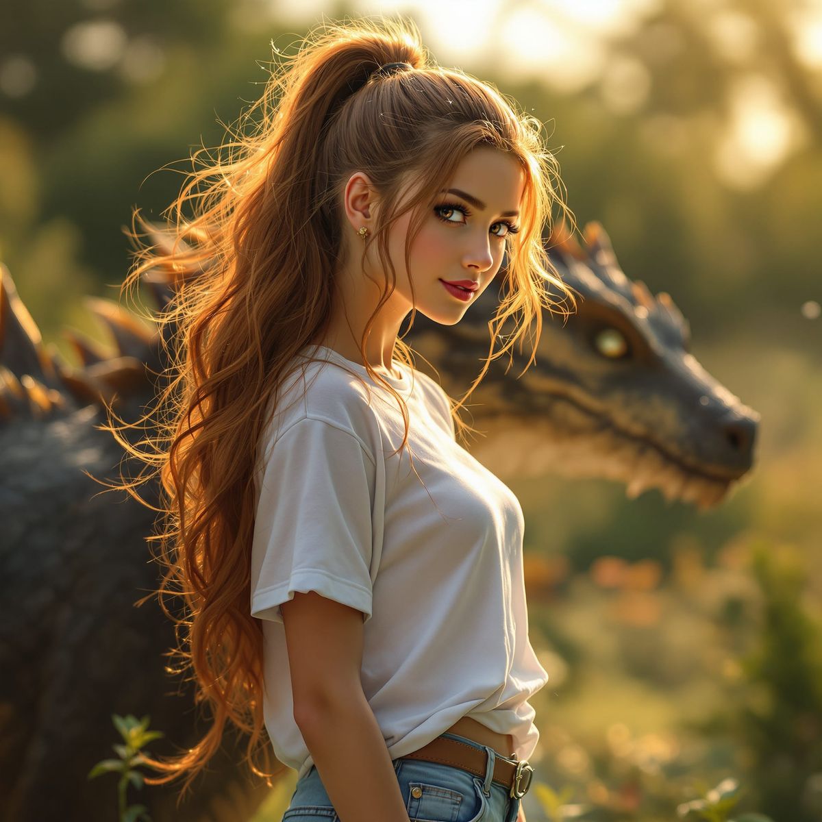 Photorealistic, beautiful lady with a furless dragon, she has long wavy, auburn hair, with a high ponytail. A white T-shirt, and blue jean shorts and barefoot. Her delicate hair catches the light, as she shows a touch of sparkle with their enchanting charm. This whimsical scene resembles a magical ...