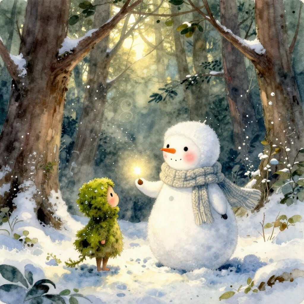 A charming snow child offers a glowing seed to a mossy forest spirit in an ancient wood. Rendered in expressive watercolor with soft edges, evoking gentle, narrative enchantment.