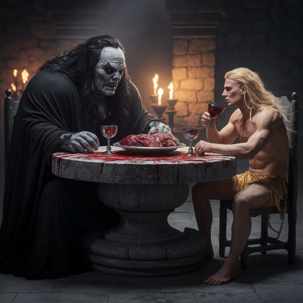 This image shows a dramatic medieval scene of a dark, powerful figure sharing a raw meat feast with a handsome, chained companion in a dimly lit castle. The artwork features dark, gothic aesthetic with warm, flickering torchlight casting intense shadows.