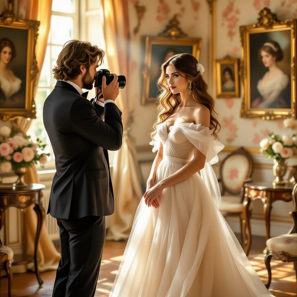 This image shows a photographer in a suit taking a portrait of a woman in a vintage gown, set in a room with golden light. The image has an impressionist aesthetic.