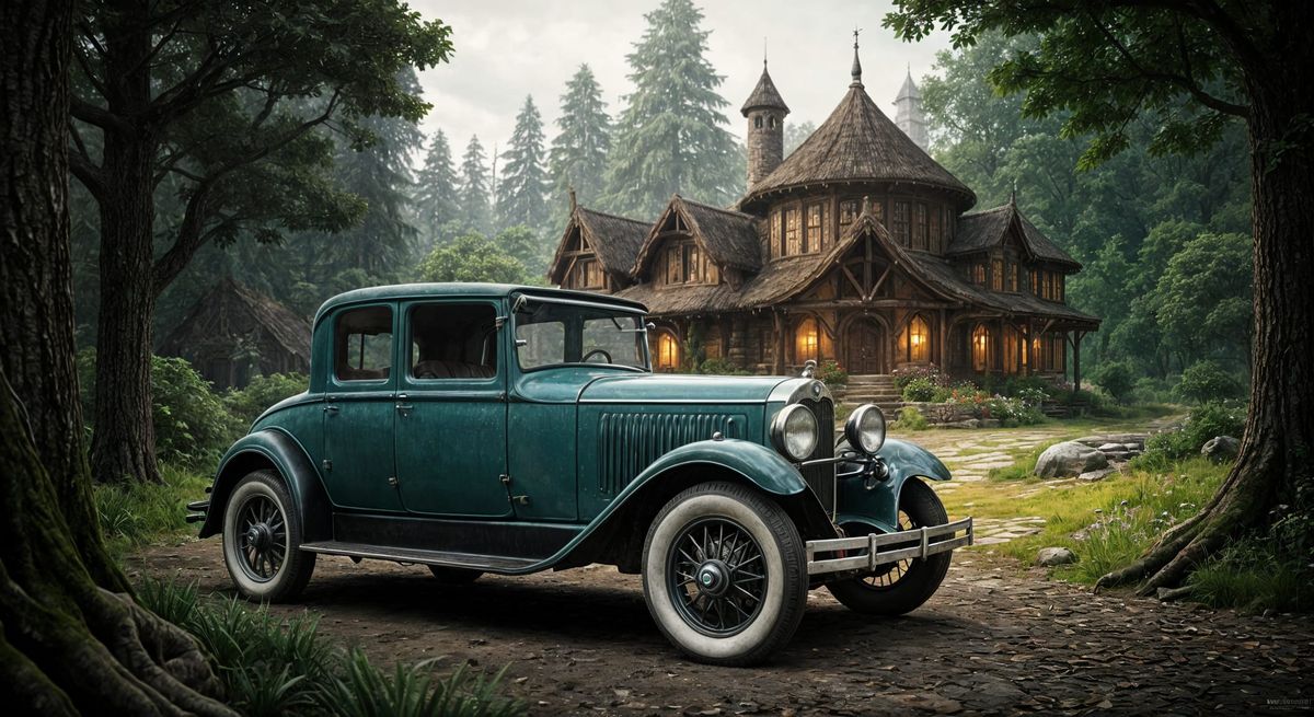 A detailed matte painting showcasing a vintage 1921 BMW parked before a quaint, elven-style cottage featuring round, castle-like towers, set within a deep forest. Fantasy concept art with complementary colors.