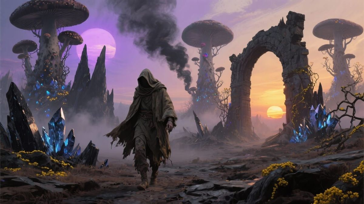 This image shows a cloaked figure walking through a desolate landscape of obsidian and fungal growth. The scene is rendered in muted tones with cinematic lighting, resembling an oil painting with a post-apocalyptic aesthetic.