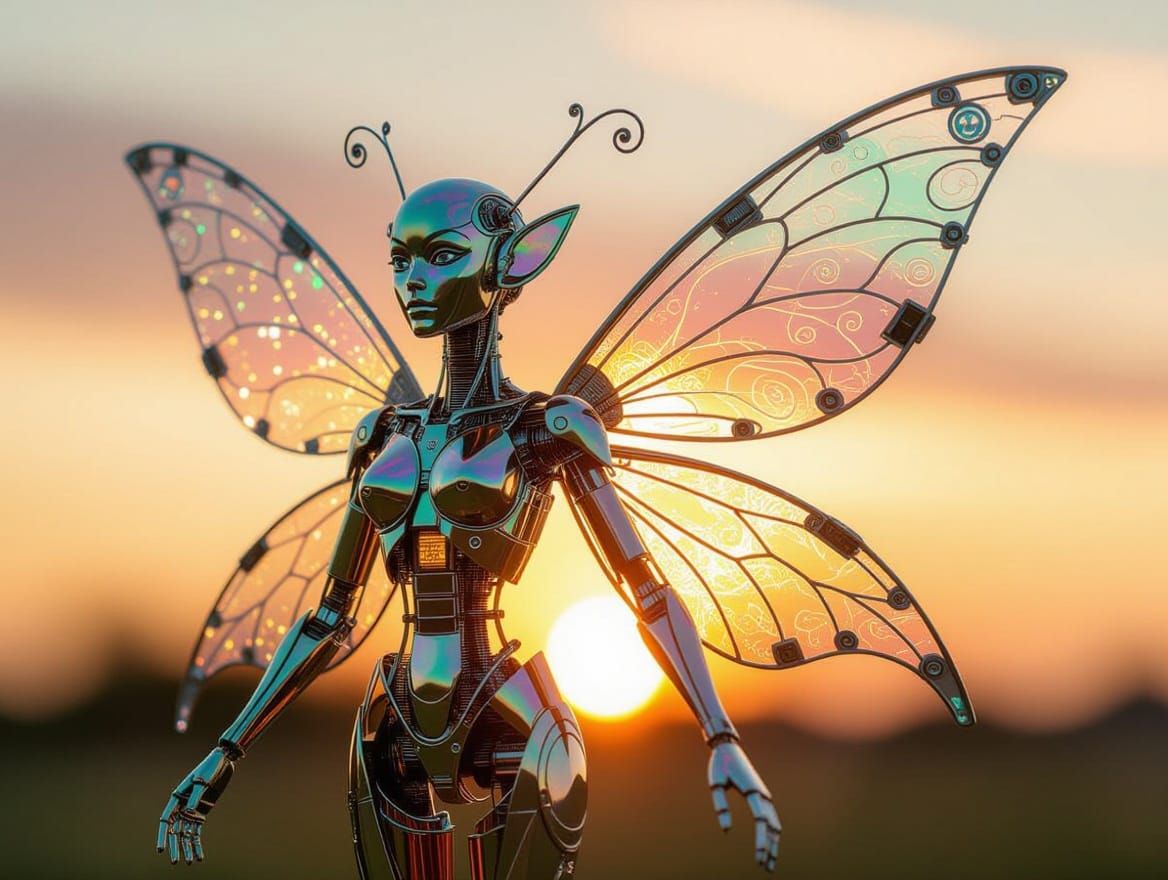 photorealistic a smoothly and elegantly evolved tiny machine being that has now evolved the power of flight, employing bits of abandoned technology it has become a patchwork bio-mechanical Fairy of love for all beings and all things, endowed with the timeless wisdom of patience and understanding it bestows ...