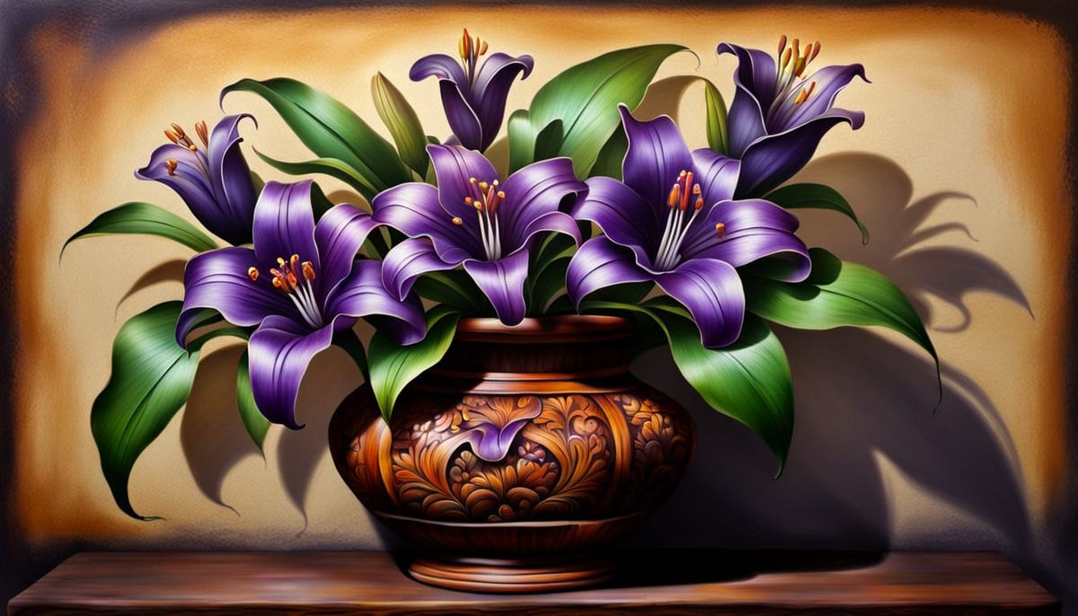This image shows a still life of a Sugilite lily in an antique carved wooden vase, rendered as airbrush art. The dark setting enhances the vibrant colors and intricate details.