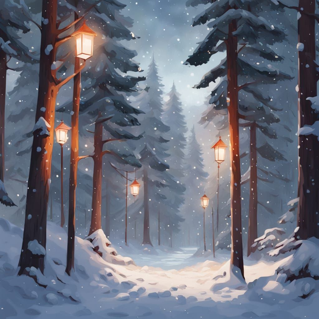 This image depicts a serene winter scene with a snowy path winding between fir trees adorned with baubles. Glowing lanterns cast soft light and long shadows, creating a magical atmosphere in a gouache and watercolor style.