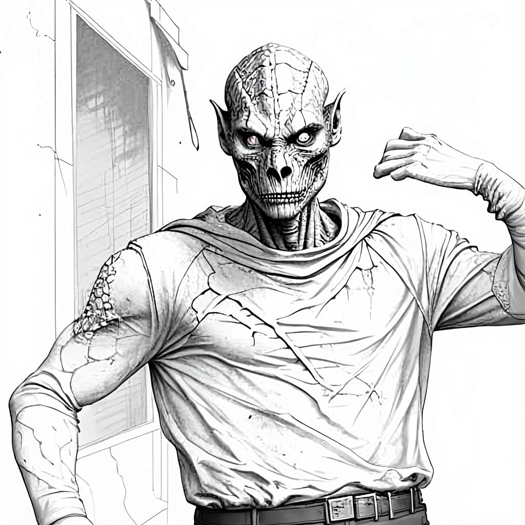 This image depicts a reptilian man experiencing a failed experiment. The scene is rendered with a distorted perspective, suggesting a chaotic and unsettling atmosphere, reminiscent of Fernando Vicente's style.