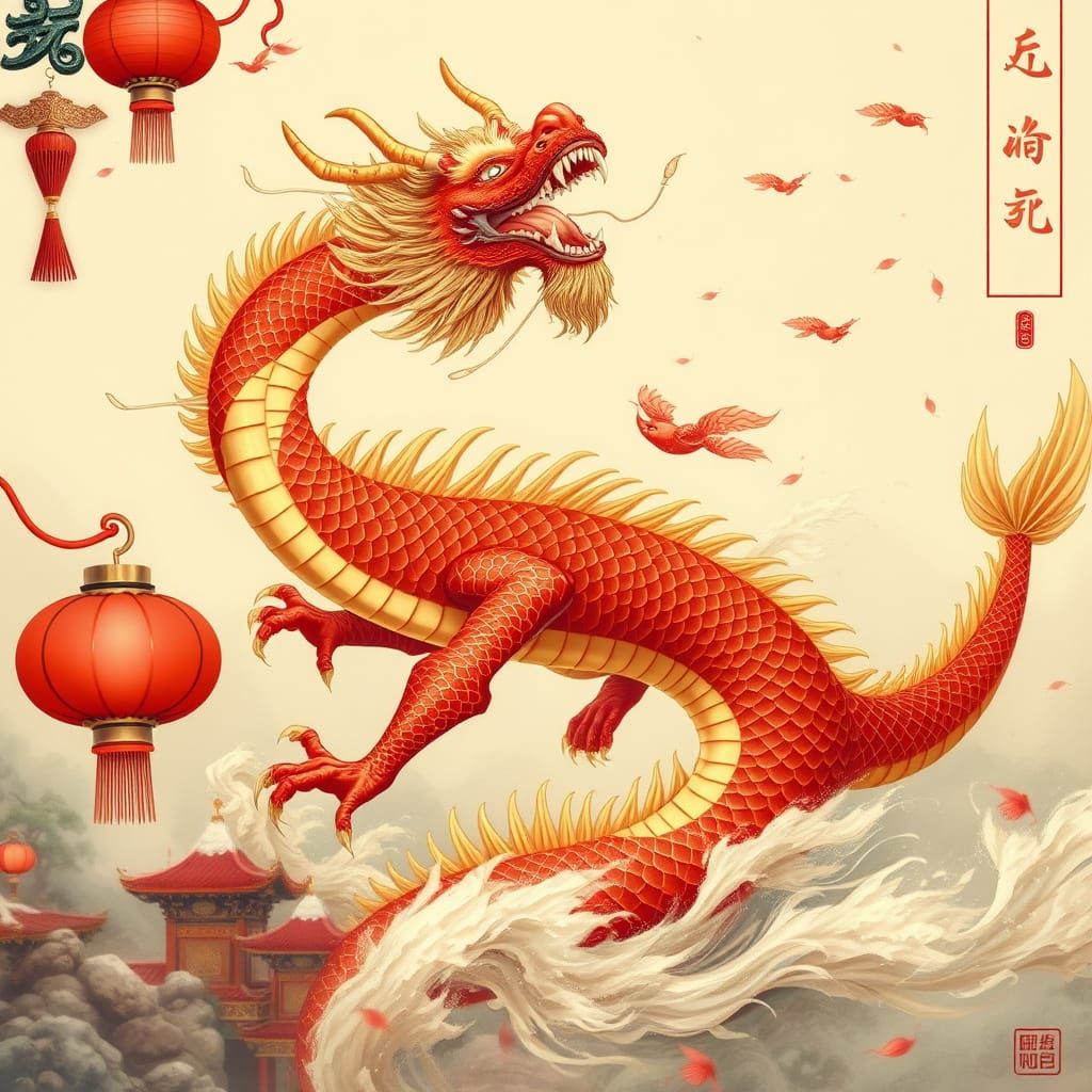 A dynamic image of a traditional Chinese dragon swirling amidst cultural elements. The dragon features red and gold colors with exaggerated details, in a fantasy style inspired by classic Chinese art.