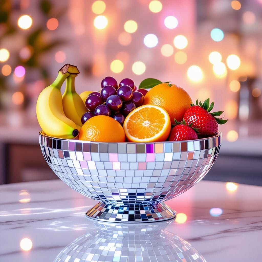 A mesmerizing chrome fruit bowl resembling a disco ball spins on a marble counter. Filled with futuristic fruit and bathed in shimmering light, this image is rendered as digital art.